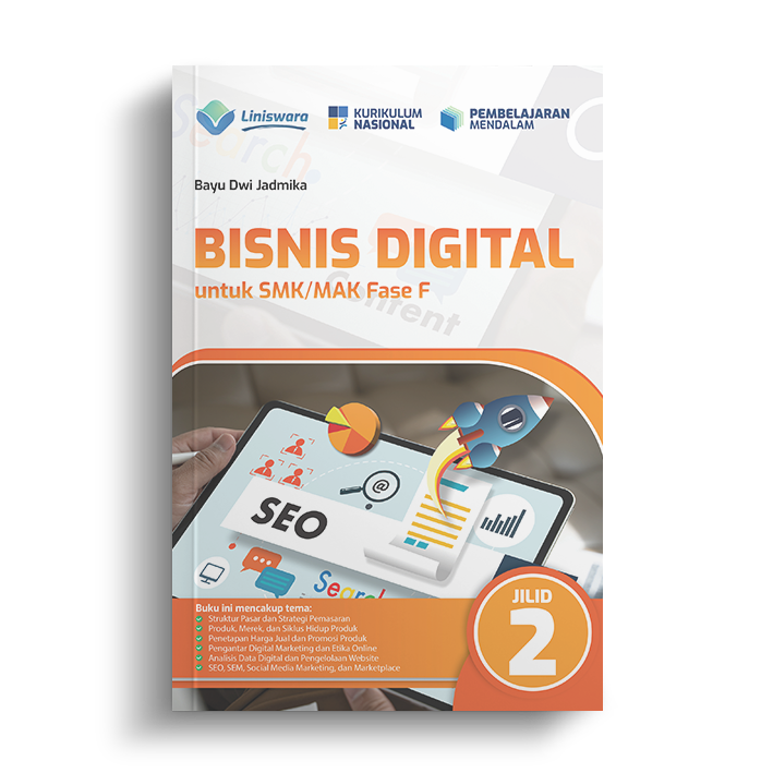 Judul: Bisnis Digital SMK/MAK Fase F Jilid 2Penulis: Bayu Dwi Jadmika Editor: Maulida Nailul CamaliaJumlah Halaman: 183Buku ini disusun untuk mendukung proses pembelajaran yang efektif, aktif, dan bermakna, serta membantu murid dalam memahami materi secara sistematis dan aplikatif. Di dalamnya telah dilengkapi dengan metode pembelajaran yang kontekstual, tugas-tugas yang mengasah pemikiran kritis, aktivitas pembelajaran yang mendorong keterlibatan aktif, serta uji kompetensi pada setiap bab untuk memastikan ketercapaian tujuan pembelajaran secara menyeluruh.Materi dalam buku ini terbagi ke dalam enam bab utama, yaitu 1) Struktur Pasar dan Strategi Pemasaran; 2) Produk, Merek, dan Siklus Hidup Produk; 3) Penetapan Harga Jual dan Promosi Produk; 4) Digital Marketing dan Etika Online; 5) Analisis Data Digital dan Pengelolaan Website; serta 6) SEO, SEM, Social Media Marketing, dan Marketplace. Setiap bab disusun secara terstruktur agar murid tidak hanya memahami aspek teoretis, tetapi juga terampil dalam praktik kerja lapangan sesuai standar kompetensi industri.